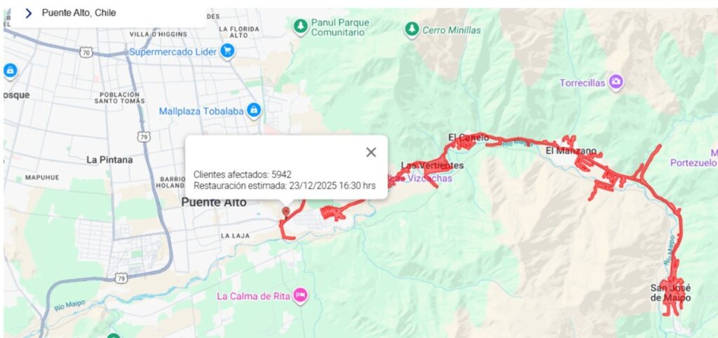 Un corte de energía eléctrica afecta a esta hora a 5.942 clientes en distintos sectores de las comunas de Puente Alto y San José de Maipo, según información preliminar entregada por la empresa distribuidora.