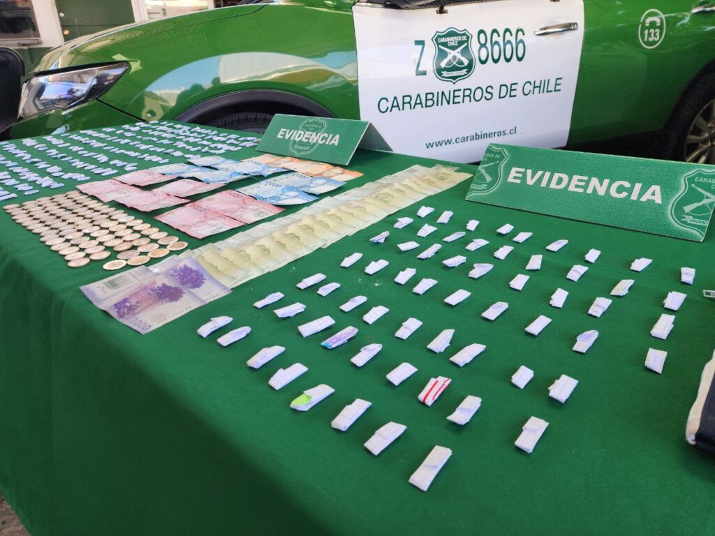Durante el procedimiento, Carabineros incautó un total de 262 envoltorios cuadriculados de papel contenedores de clorhidrato de cocaína, los cuales se encontraban listos para su comercialización. Además, se decomisó $166.000 en dinero en efectivo, en billetes y monedas de distinta denominación, junto a diversas especies asociadas al ilícito, las que fueron puestas a disposición del Ministerio Público como parte de la evidencia.