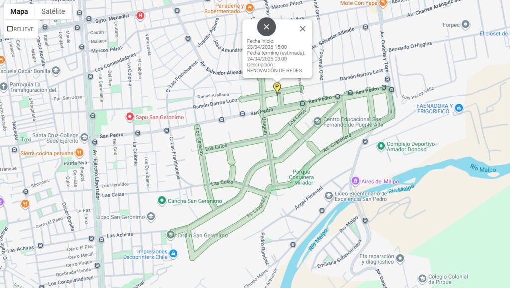 La interrupción del suministro afectará al cuadrante comprendido entre calle San Pedro, Avenida Concha y Toro, Avenida Costanera y Los Cerezos, abarcando tanto viviendas como recintos comerciales ubicados dentro de ese perímetro.