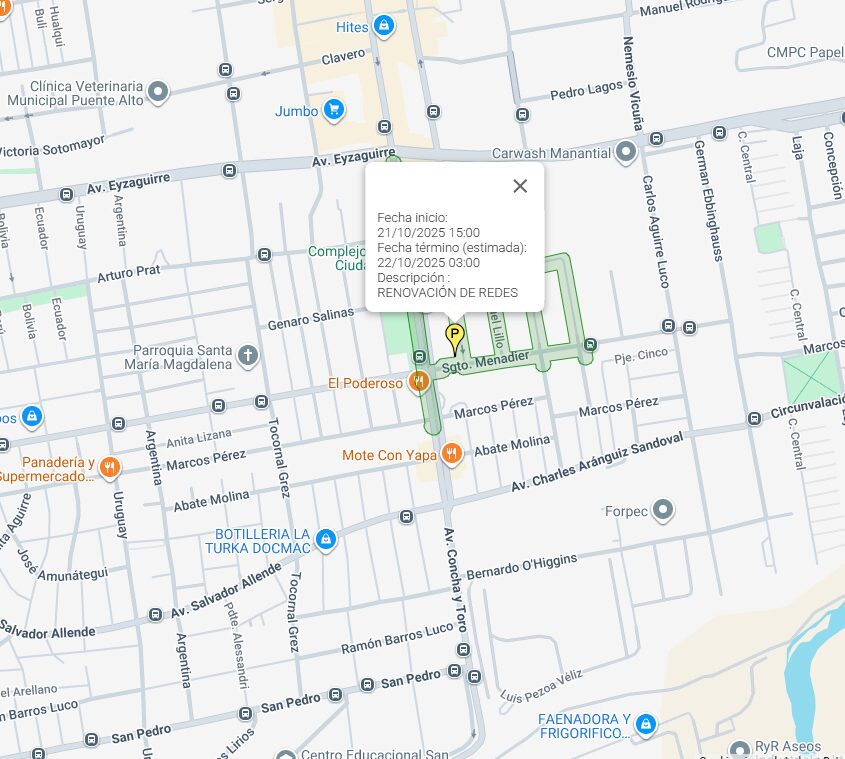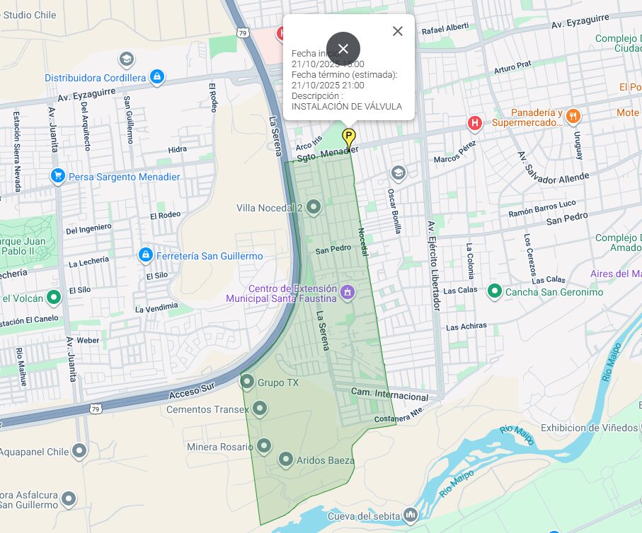 De acuerdo con la información publicada en el sitio web de la sanitaria, una de las zonas afectadas corresponde al cuadrante comprendido entre Caletera Acceso Sur, Sargento Menadier, Nocedal y Costanera, donde la interrupción del suministro se extenderá hasta aproximadamente las 21:00 horas de esta jornada. El motivo del corte es la instalación de una válvula en la red.