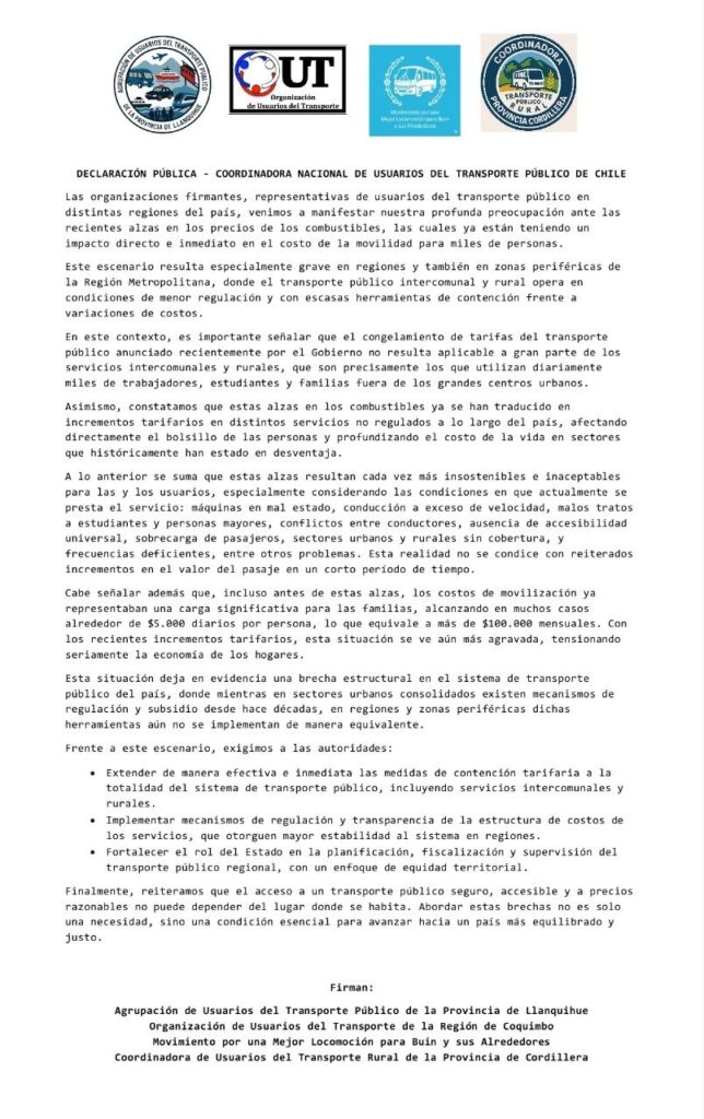 Junto a la Coordinadora de Usuarios del Transporte Rural de la Provincia de Cordillera, se hicieron parte de la comunicación la Agrupación de Usuarios del Transporte Público de la Provincia de Llanquihue, la Organización de Usuarios del Transporte de la Región de Coquimbo y el Movimiento por una Mejor Locomoción para Buin y sus Alrededores.