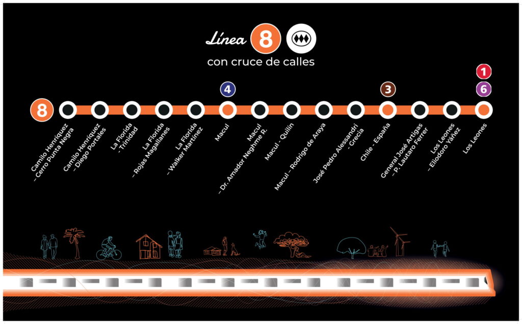 La Línea 8, según información oficial de Metro de Santiago, tendrá un trazado de 19 kilómetros y 14 estaciones, uniendo Providencia con Puente Alto a través de las avenidas Los Leones, José Pedro Alessandri, Macul y La Florida. El proyecto beneficiará a 1,9 millones de personas y permitirá realizar el viaje entre Providencia y Puente Alto en 23 minutos, lo que representa una reducción del 59% respecto del tiempo actual.