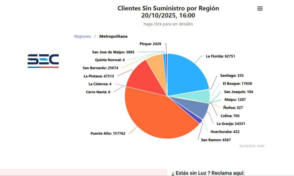 Un masivo corte de energía eléctrica afecta la tarde de este lunes 20 de octubre a diversas comunas de la Región Metropolitana, incluyendo la totalidad de la Provincia de Cordillera.