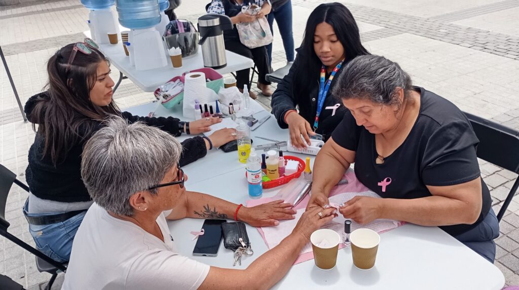 La iniciativa ofreció a los asistentes distintos servicios y espacios de acompañamiento, entre ellos stands informativos, manicure con esmalte rosa, limpieza facial, y la entrega de horas para la realización de mamografías en los centros de salud comunales.