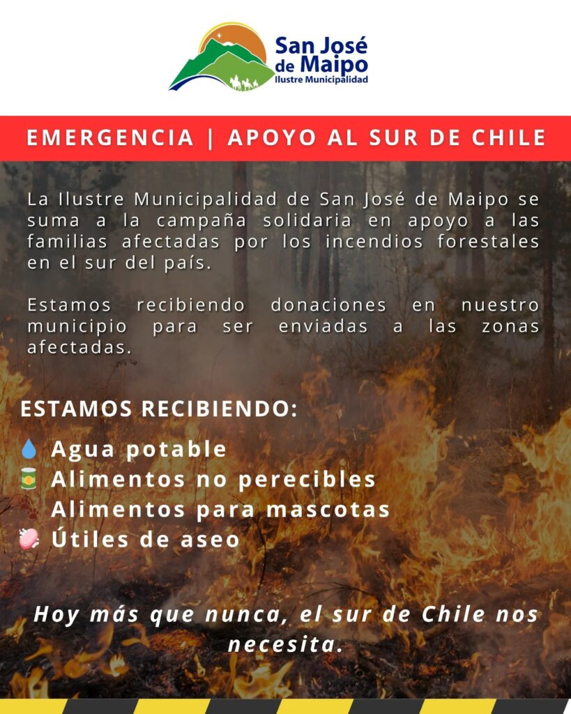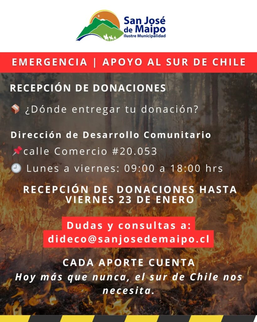 La Municipalidad de San José de Maipo informó que se sumó a la campaña solidaria nacional en apoyo a las familias afectadas por los incendios forestales que se mantienen activos en el sur del país, habilitando un centro de acopio comunal para la recepción de donaciones.