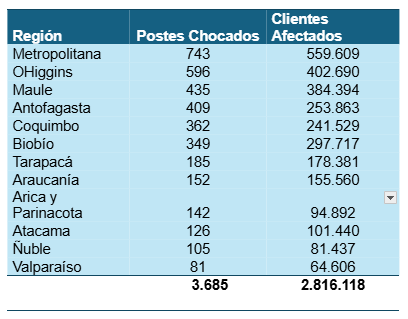 Le sigue la región de O´Higgins, con 402.690 clientes afectados; Maule con 384.394; Biobío con 297.717; Antofagasta con 253.863 y Coquimbo con 241.529 clientes afectados en su suministro por postes chocados. Más atrás se ubican Arica y Parinacota, Tarapacá, Atacama, Valparaíso, Ñuble y Araucanía (ver tabla).