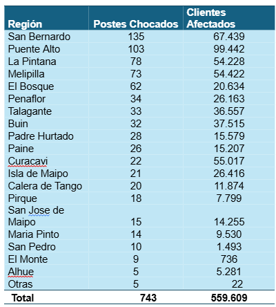 Por cantidad de clientes afectados con las interrupciones de suministro producto de los postes chocados, la región que lidera las estadísticas en la zona de concesión de CGE es la Metropolitana, con 743 postes y 559.609 clientes sin servicio durante el 2025.