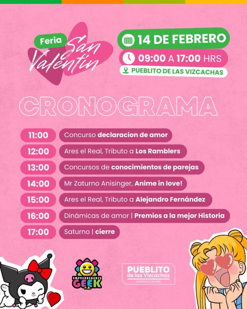 “Este 14 de febrero en Pueblito de Las Vizcachas: shows en vivo, concursos con premios, tiendas geek, zona gourmet y más. ¡Ven con tu pareja o amigos!”, especificaron.